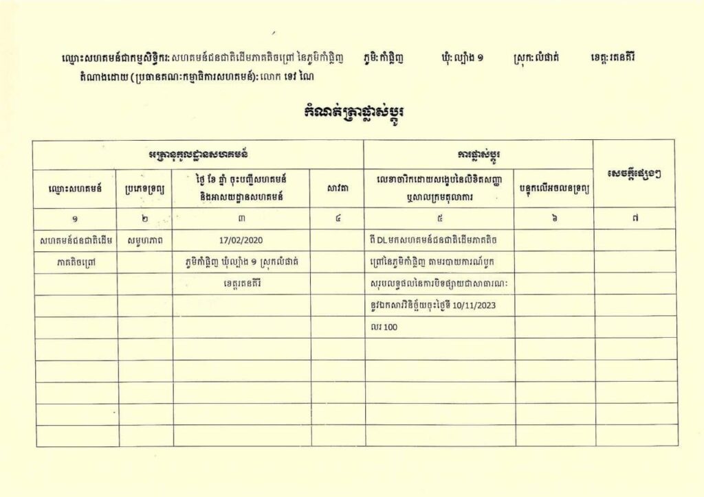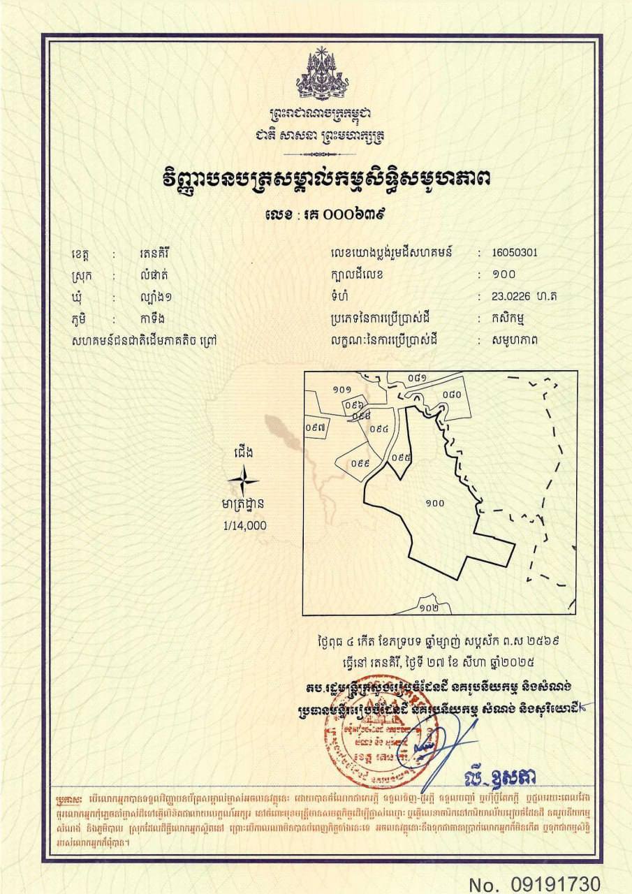 ខេត្តរតនគិរី ៖ ដីសហគមន៍ជនជាតិដើមភាគតិចព្រៅ មានទំហំ ២៣.០២២៦ ហិកតា ស្ថិតនៅភូមិកាទឹង ឃុំល្បាំង១ ស្រុកលំផាត់ ខេត្តរតនគិរីត្រូវបានចុះបញ្ជី។