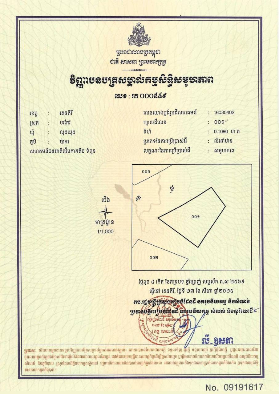 ខេត្តរតនគិរី ៖ ដីសហគមន៍ជនជាតិដើមភាគតិច ទំពួន ទំហំ ០.១០៨០ ហិកតាស្ថិតនៅភូមិប៉ាអរ ឃុំលុងឃុង ស្រុកបរកែវ ខេត្តរតនគិរីត្រូវបានចុះបញ្ជីដី។