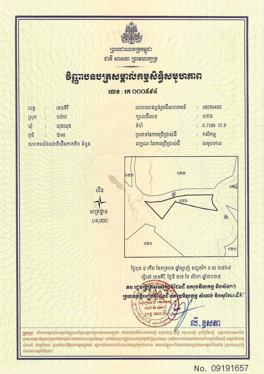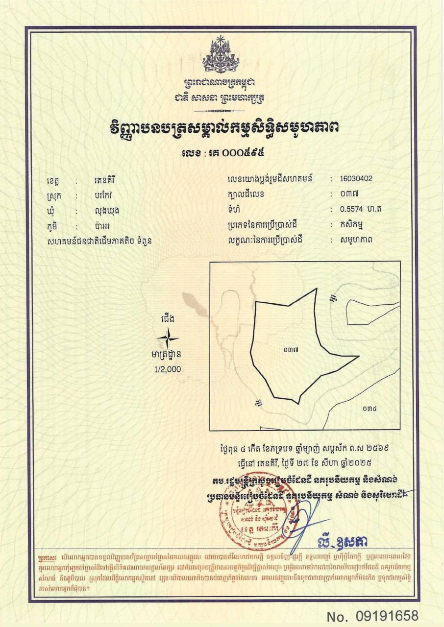 ២. ក្បាលដីលេខ ០៣៧ មានទំហំ ០.៥៥៧៤ ហិកតា ស្ថិតនៅភូមិប៉ាអរ ឃុំលុងឃុង ស្រុកបរកែវ ខេត្តរតនគិរី។