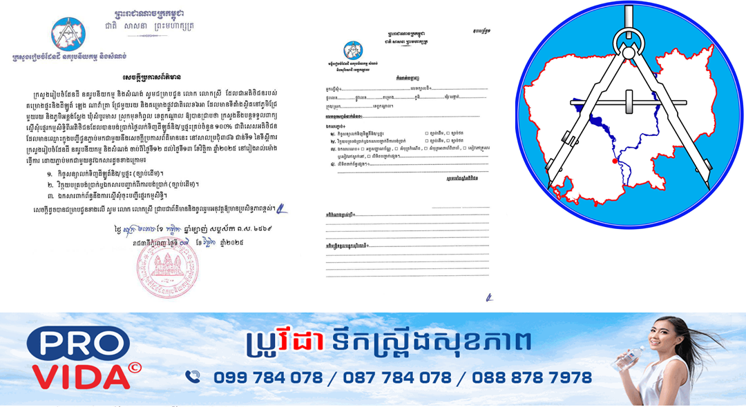 ភ្នំពេញ ៖ ក្រសួងរៀបចំដែនដី នគរូបនីយកម្ម និងសំណង់ បានចេញសេចក្តីប្រកាស ស្តីពី ការអញ្ជើញអតិថិជនរបស់បុរី ឡេង ណាវ៉ាត្រា គម្រោងជ្រែមួយរយ និងគម្រោងផ្លូវជាតិលេខ៦អា ស្ថិតនៅឃុំសំបួរមាស ស្រុកមុខកំពូល ខេត្តកណ្តាល មកដាក់ពាក្យស្នើសុំផ្ទេរកម្មសិទ្ធិ សម្រាប់អតិថិជនដែលបានបង់ប្រាក់ថ្លៃលក់ទិញដីឡូត៍និង/ឬផ្ទះគ្រប់ចំនួន (១០០%) ចាប់ពីថ្ងៃទី១២ ដល់ថ្ងៃទី១៣ ខែវិច្ឆិកា ឆ្នាំ២០២៥ នៅរៀងរាល់ម៉ោងធ្វើការ ដោយភ្ជាប់មកជាមួយនូវឯកសារពាក់ព័ន្ធដូចមានក្នុងសេចក្តីប្រកាសព័ត៌មាន។