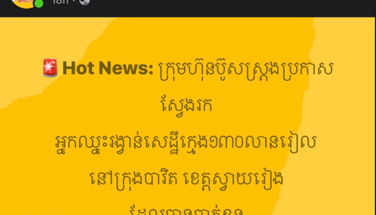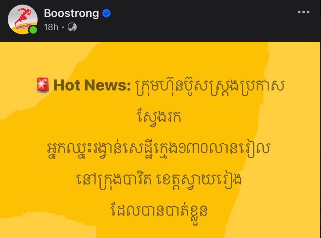 សូមជួយស៊ែដំណឹងបន្ទាន់នេះផង អ្នកលក់ប៊ូសស្រ្តងនៅក្រុងបាវិត ឆោឡោស្វែងរកម្ចាស់រង្វាន់សេដ្ឋីក្មេង 130លានរៀលដែលបាត់ខ្លួនមិនព្រមទាក់ទងមកក្រុមហ៊ុនសោះ ក្រោយពីទិញប៊ូសស្រ្តងនៅកន្លែងគាត់ គាស់ត្រូវរង្វាន់ធំ។ មកទល់ដល់ពេលនេះ ក្រុមហ៊ុនប៊ូសស្រ្តង និងអ្នកលក់ប៊ូសស្រ្តង មិនទាន់រកឃើញគាត់ទេ សង្ស័យតែត្រូវរង្វាន់ធំ លុយច្រើនពេក រហូតដល់ 130លាន ស្មើនឹងជិត4ម៉ឺនដុល្លារឯណោះ គាត់ភ័យខ្លាចផង ហើយអរផង ទើបមិនហ៊ានជួបអ្នកលក់។ បើតាមសម្ដីក្រុមហ៊ុនប៊ូសស្រ្តង បានឱ្យដឹងថា រង្វាន់សេដ្ឋីក្មេង 130លាន គឺអ្នកឈ្នះទទួលបាន100លានរៀល ហើយអ្នកលក់ប៊ូសស្រ្តង 30នាក់ បានម្នាក់ៗ1លានរៀល។