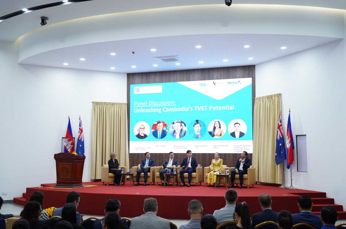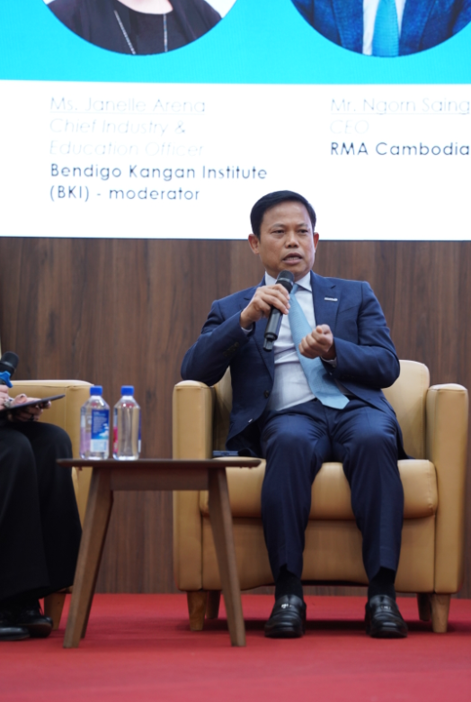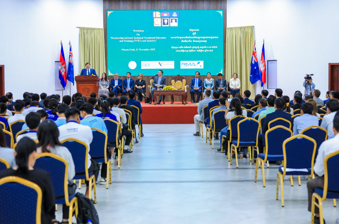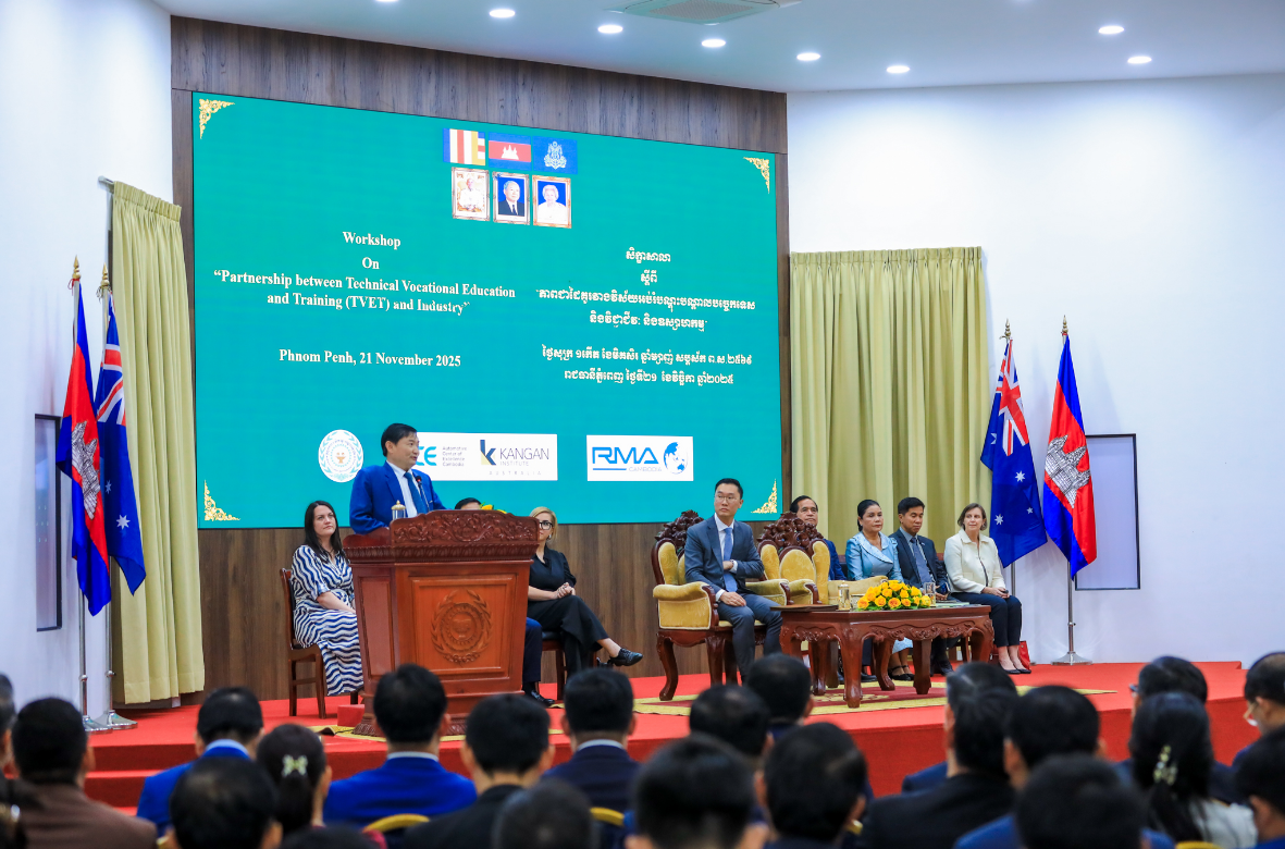 Phnom Penh, 21 November 2025 – Mr. Ngorn Saing, CEO of RMA (Cambodia) Plc., was invited as a distinguished speaker at the panel discussion held under the workshop on “The Partnership Between the Technical Vocational Education and Training and Industry.” The workshop was jointly organized by the Ministry of Labour and Vocational Training, Bendigo Kangan Institute (BKI), and supported by the Corporate Social Responsibility (CSR) program of RMA (Cambodia) Plc. The event took place at the National Technical Training Institute on 21 November 2025. The program was honored by the high presence of H.E. Heng Sour, Minister of Labour and Vocational Training, and H.E. Derek Yip, Australian Ambassador to the Kingdom of Cambodia, who co-presided over the workshop’s closing ceremony.