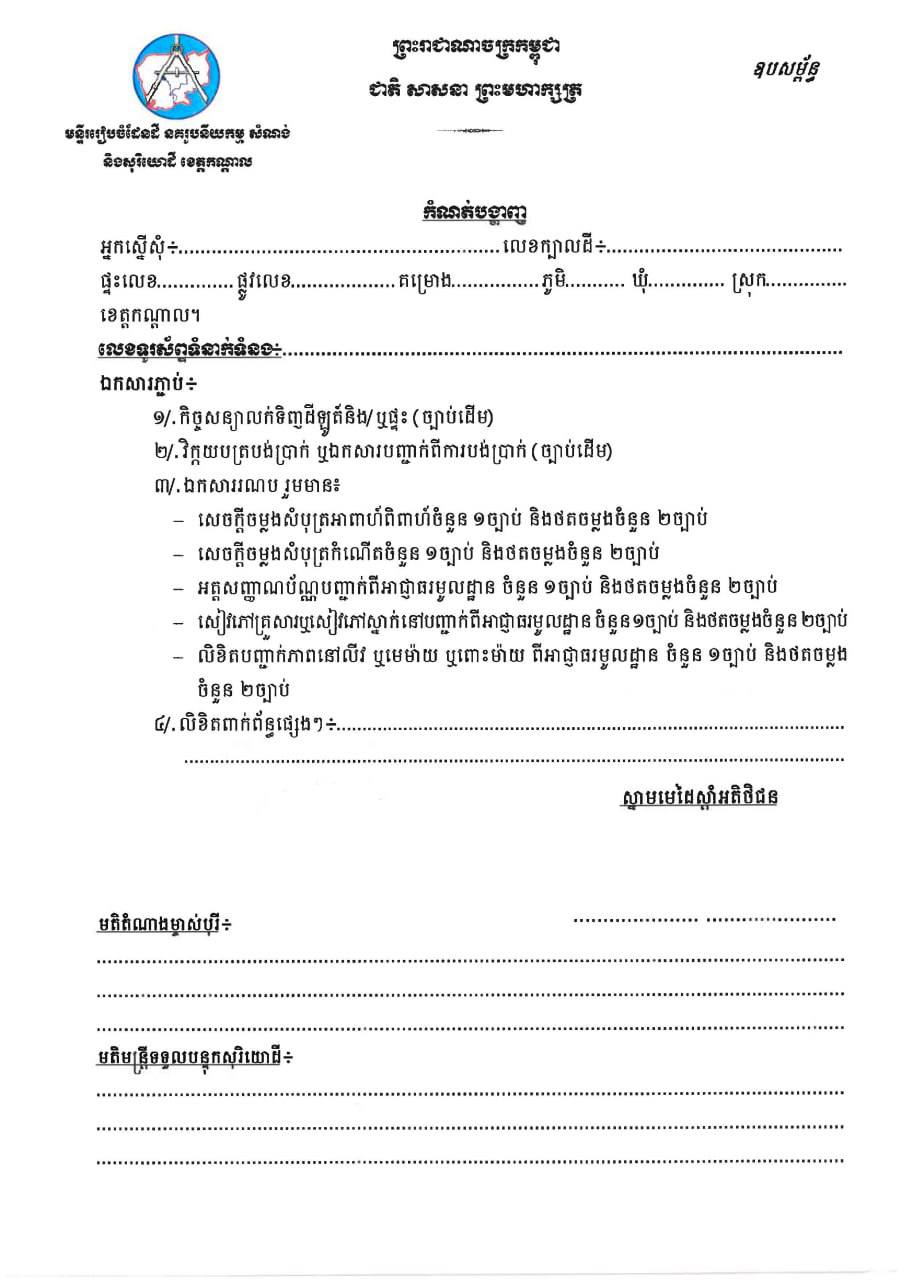 ខេត្តកណ្តាល ៖ សូមអញ្ជើញអតិថិជនរបស់គម្រោងផ្ទះនិងដីឡូត៍ ឡេង ណាវ៉ាត្រា ជ្រែមួយរយ និងគម្រោងផ្លូវជាតិលេខ៦អា ស្ថិតនៅភូមិជ្រែមួយរយ និងភូមិអន្លង់ស្លែង ឃុំសំបួរមាស ស្រុកមុខកំពូល ខេត្តកណ្តាល មកដាក់ពាក្យស្នើសុំផ្ទេរកម្មសិទ្ធិសម្រាប់អតិថិជនដែលបានបង់ប្រាក់ថ្លៃលក់ទិញដីឡូត៍និង/ឬផ្ទះគ្រប់ចំនួន (១០០%) ចាប់ពីថ្ងៃទី៣០ ខែធ្នូ ឆ្នាំ២០២៥ រហូតដល់ថ្ងៃទី២៨ ខែកុម្ភៈ ឆ្នាំ២០២៦ រៀងរាល់ម៉ោងធ្វើការ ដោយភ្ជាប់មកជាមួយនូវឯកសារពាក់ព័ន្ធដូចមានក្នុងសេចក្តីប្រកាសព័ត៌មាន។
