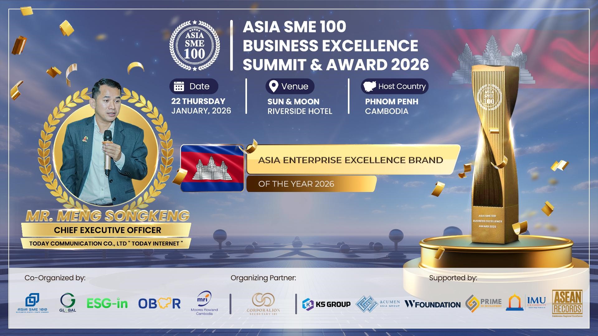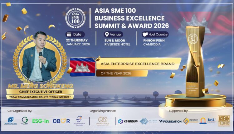 សាទរដល់លោក ម៉េង សុងកេង ជានាយកប្រតិបត្តិនៃក្រុមហ៊ុន TODAY internet ដែលបានទទួលពានរង្វាន់ “ASIA SME 100 BUSINESS EXCELLENCE SUMMIT & AWARD 2026″ On “ASIA ENTERPRISE EXCELLENCE BRAND OF THE YEAR 2026″ ដ៏ឆ្នើមមួយនេះ។ សមិទ្ធិផលដ៏គួរឲ្យកត់សម្គាល់នេះគឺជាសក្ខីភាពមួយចំពោះការប្តេជ្ញាចិត្តមិនងាករេរបស់អ្នកចំពោះឧត្តមភាព ការច្នៃប្រឌិត និងភាពជាអ្នកដឹកនាំនៅទូទាំងតំបន់អាស៊ី។