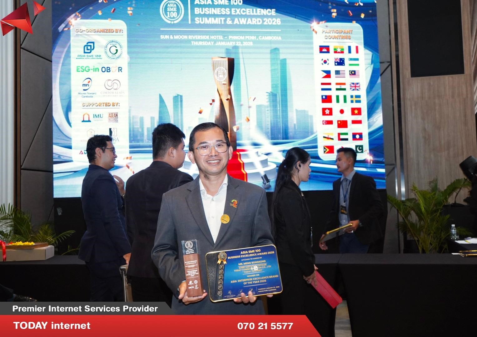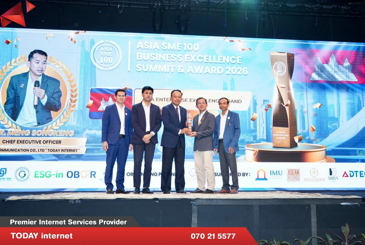 ក្រុមហ៊ុន TODAY internet គឺជាក្រុមហ៊ុនផ្ដល់សេវាអុីនធឺណិតកម្រិតខ្ពស់ដែលបង្កើតឡើង ដោយស្នាដៃកូនខ្មែរចាប់តាំងពីឆ្នាំ ២០១៦ មកម្លេ៉ះ។ កាលពីពេលថ្មីៗនេះលោក ម៉េង សុងកេង ដែលជានាយកប្រតិបត្តិនៃក្រុមហ៊ុន TODAY internet បានទទួលពានរង្វាន់ “ASIA SME 100 BUSINESS EXCELLENCE SUMMIT & AWARD 2026″ On “ASIA ENTERPRISE EXCELLENCE BRAND OF THE YEAR 2026″។ កម្មវិធីនេះគឺជាកម្មវិធីមួយទទួលស្គាល់នូវធុរកិច្ចក្នុងតំបន់ និងព្រឹត្តិការណ៍ផ្តល់ពានរង្វាន់ក្នុងគោលបំណងអបអរសាទរ និងផ្តល់កិត្តិយសទៅដល់សហគ្រាសធុនតូច និងមធ្យម (SMEs) ដែលទទួលបានជោគជ័យនៅទូទាំងអាស៊ីសម្រាប់ដំណើរ