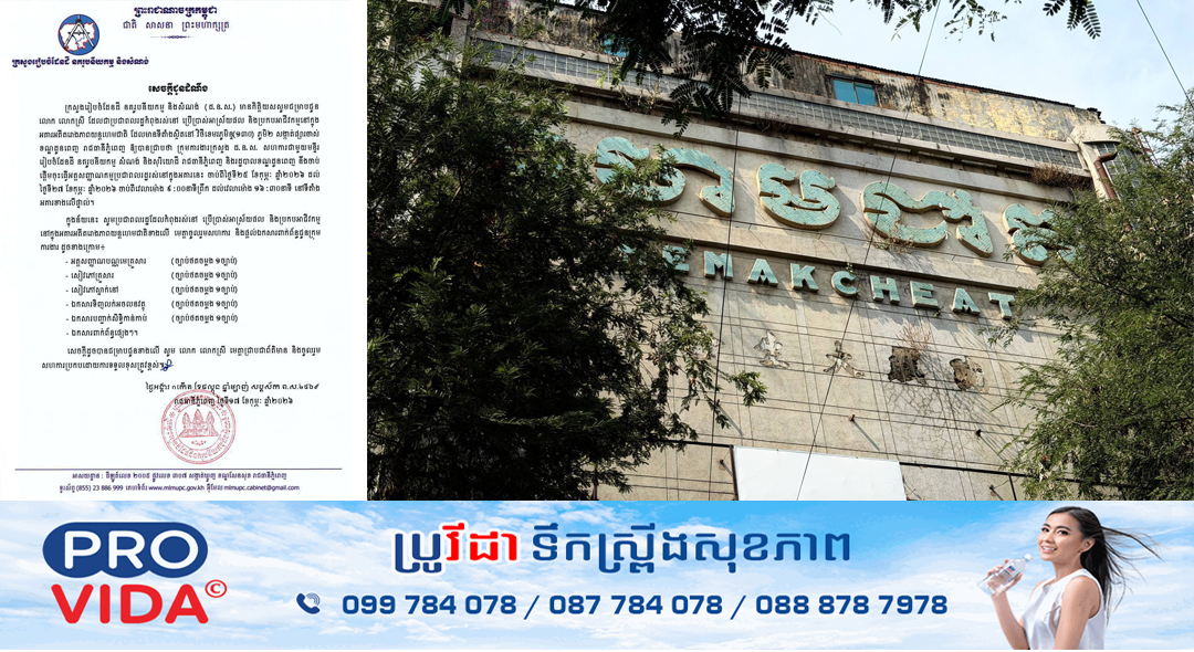 ក្រសួងរៀបចំដែនដី នគរូបនីយកម្ម និងសំណង់ ជម្រាបជូន បងប្អូនប្រជាពលរដ្ឋកំពុងរស់នៅ ប្រើប្រាស់អាស្រ័យផល និងប្រកបអាជីវកម្មនៅក្នុង អគារអតីតរោងភាពយន្តហេមជាតិ ស្ថិតនៅវិថីខេមរភូមិន្ទ(១៣០)