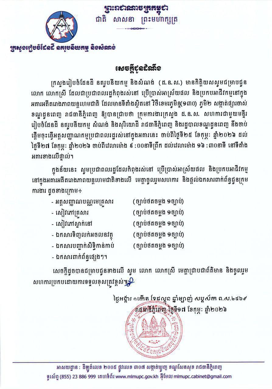 ក្រសួងរៀបចំដែនដី នគរូបនីយកម្ម និងសំណង់ ជម្រាបជូន បងប្អូនប្រជាពលរដ្ឋកំពុងរស់នៅ ប្រើប្រាស់អាស្រ័យផល និងប្រកបអាជីវកម្មនៅក្នុង អគារអតីតរោងភាពយន្តហេមជាតិ ស្ថិតនៅវិថីខេមរភូមិន្ទ(១៣០) ភូមិ២ សង្កាត់ផ្សារចាស់ ខណ្ឌដូនពេញ រាជធានីភ្នំពេញ អញ្ជើញចូលរួមធ្វើអត្តសញ្ញាណកម្មប្រជាពលរដ្ឋរស់នៅក្នុងអគារនេះទៅទីតាំងនិងពេលវេលាដូចខាងក្រោម៖