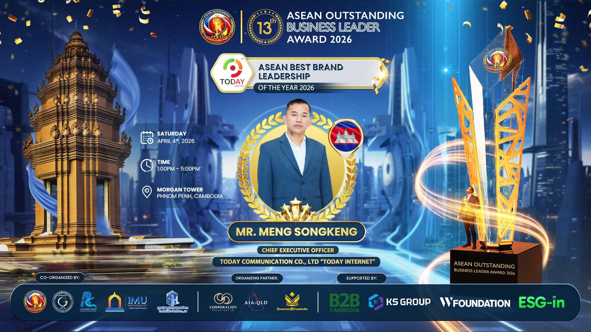 ក្រុមហ៊ុន TODAY internet បានទទួលពានរង្វាន់ឆ្នើម ASEAN Outstanding Business Leader Award 2026 នៅអាគារ Morgan Tower