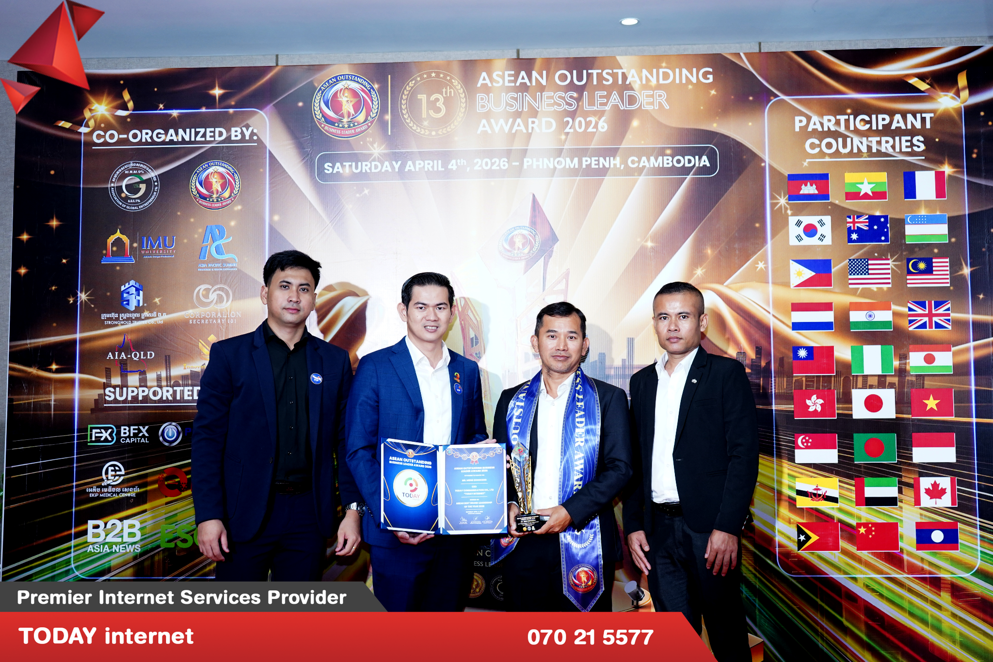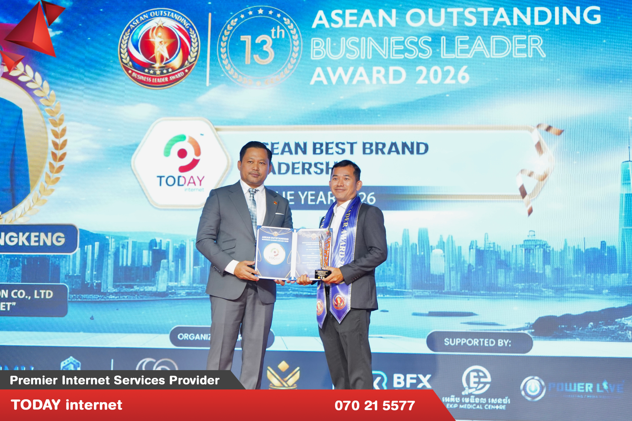 ក្រុមហ៊ុន TODAY internet គឺជាក្រុមហ៊ុនផ្ដល់សេវាអុីនធឺណិតកម្រិតខ្ពស់ដែលបង្កើតឡើង ដោយស្នាដៃកូនខ្មែរចាប់តាំងពីឆ្នាំ ២០១៦ មកម្លេះ។ កាលពីពេលថ្មីៗនេះក្រុមហ៊ុន TODAY internet បានទទួលពានរង្វាន់ “ASEAN Outstanding Business Leader Award 2026”។ កម្មវិធីនេះគឺជាកម្មវិធីមួយទទួលស្គាល់នូវធុរកិច្ចក្នុងតំបន់ និងព្រឹត្តិការណ៍ផ្តល់ពានរង្វាន់ក្នុងគោលបំណងអបអរសាទរ និងផ្តល់កិត្តិយសទៅដល់សហគ្រាសធុនតូច និងមធ្យម (SMEs) ដែលទទួលបានជោគជ័យនៅទូទាំងអាស៊ីសម្រាប់ដំណើរការអាជីវកម្មឆ្នើម ការរីកលូតលាស់ ការបង្កើតថ្មី និងឧត្តមភាព។ សម្រាប់ពានរង្វាន់នេះដែលគឺទទួលស្គាល់នូវឧត្តមភាពក្នុងការអនុវត្តអាជីវកម្ម ភាពជាអ្នកដឹកនាំ ការច្នៃប្រឌិត និងកំណើន SME នៅទូទាំងតំបន់អាស៊ី។